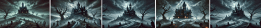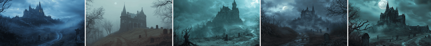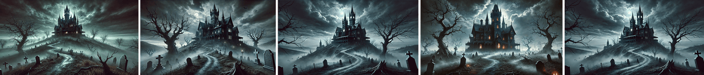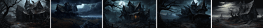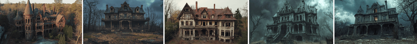 The collection includes images of 100+ haunted houses, derelict locations, and creepy homes in various illustrated and photo-realistic styles.